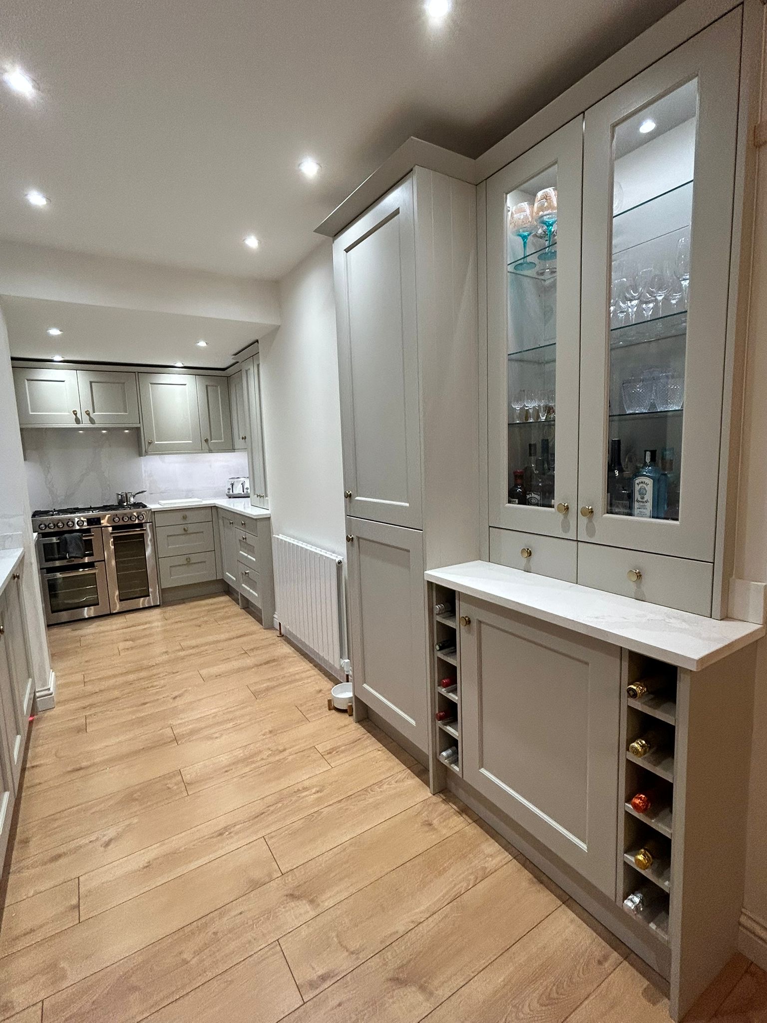 Quartz worktops and AEG appliances provide durability, while a bespoke drinks bar adds a distinctive feature within the renovated space.